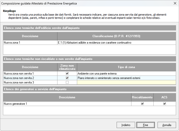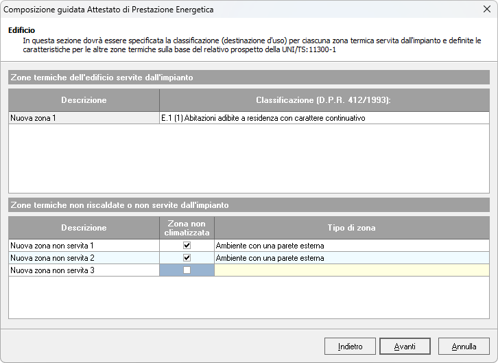 Qui si definiscono le zone termiche dell'edificio. Compilare il campo Descrizione e selezionare la tipologia di classificazione secondo il D.P.R. 412/1993 (ad esempio, E.1 (1) Abitazioni adibite a residenza con carattere continuativo).