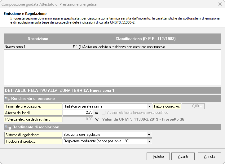 Nella schermata Emissione e Regolazione specificare, per ciascuna zona termica, le caratteristiche dei sottosistemi di emissione e regolazione secondo UNI/TS 11300-2.