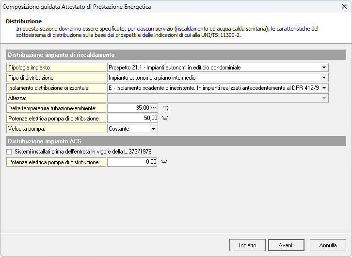 Tipologia impiantoTipo di distribuzioneIsolamento distribuzione orizzontaleDelta temperatura tubazione-ambientePotenza elettrica pompa di distribuzioneVelocità pompa