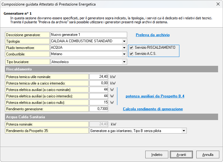1. Se sono presenti, ad esempio, un generatore per il riscaldamento e un boiler per l'ACS, indicare2. - Solo per edifici residenziali, se non è presente il servizio di ACS, è necessario indicare la simulazione di un generatore fittizio anche per l'ACS.