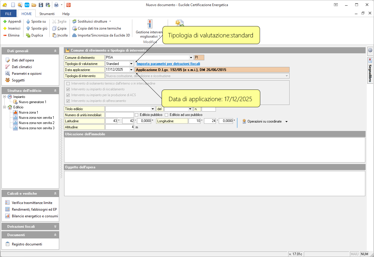 Per l'edificio, il primo campo da compilare è il comune di riferimento. Il software recupera automaticamente i dati climatici necessari al calcolo.