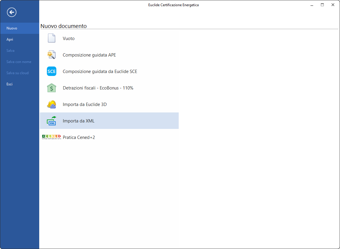 È possibile creare una pratica in Euclide Certificazione Energetica importando un file XML generato da altri software, purché conforme al tracciato di scambio XML versione 5 (estesa, CTI) previsto per i catasti energetici regionali.