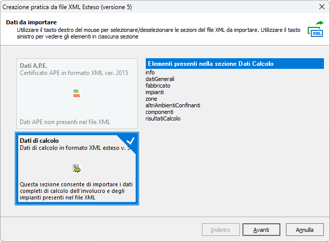 Dopo aver selezionato il file XML, viene visualizzata una finestra che consente di scegliere quali sezioni importare tra Dati APE e Dati di calcolo.
