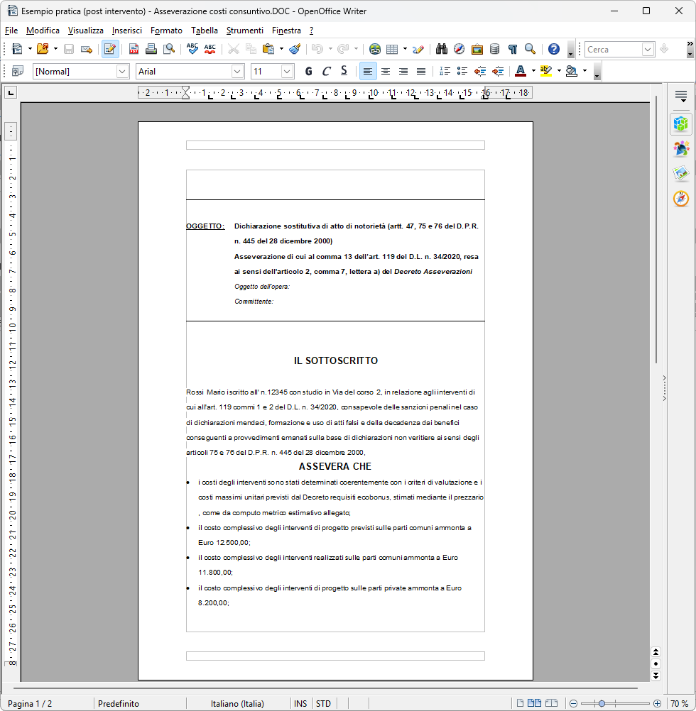 La funzione del menu Stampe | Composizione asseverazioni SuperBonus | Asseverazione del tecnico (congruità dei costi - consuntivo) consente di generare un documento in formato Microsoft® Word®, RTF, HTML o Scriba V, in base alle impostazioni generali del programma. Il documento contiene l'asseverazione con cui il tecnico incaricato attesta la congruità dei costi in fase di consuntivo.
