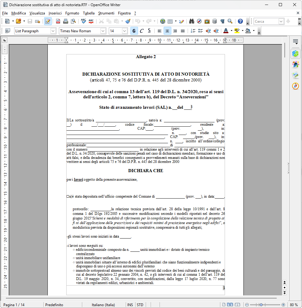 La funzione del menu Stampe | Composizione asseverazioni SuperBonus | Asseverazione del tecnico da trasmettere all'ENEA (stato di avanzamento lavori) consente di generare un documento in formato Microsoft® Word®, RTF, HTML o Scriba V, in base alle impostazioni generali del programma. Il documento contiene l'asseverazione con cui il tecnico incaricato attesta la rispondenza ai requisiti per l'accesso al SuperBonus 110% e la congruità dei costi secondo la normativa vigente, con riferimento allo stato di avanzamento lavori, sulla base del modello allegato al Decreto asseverazioni.