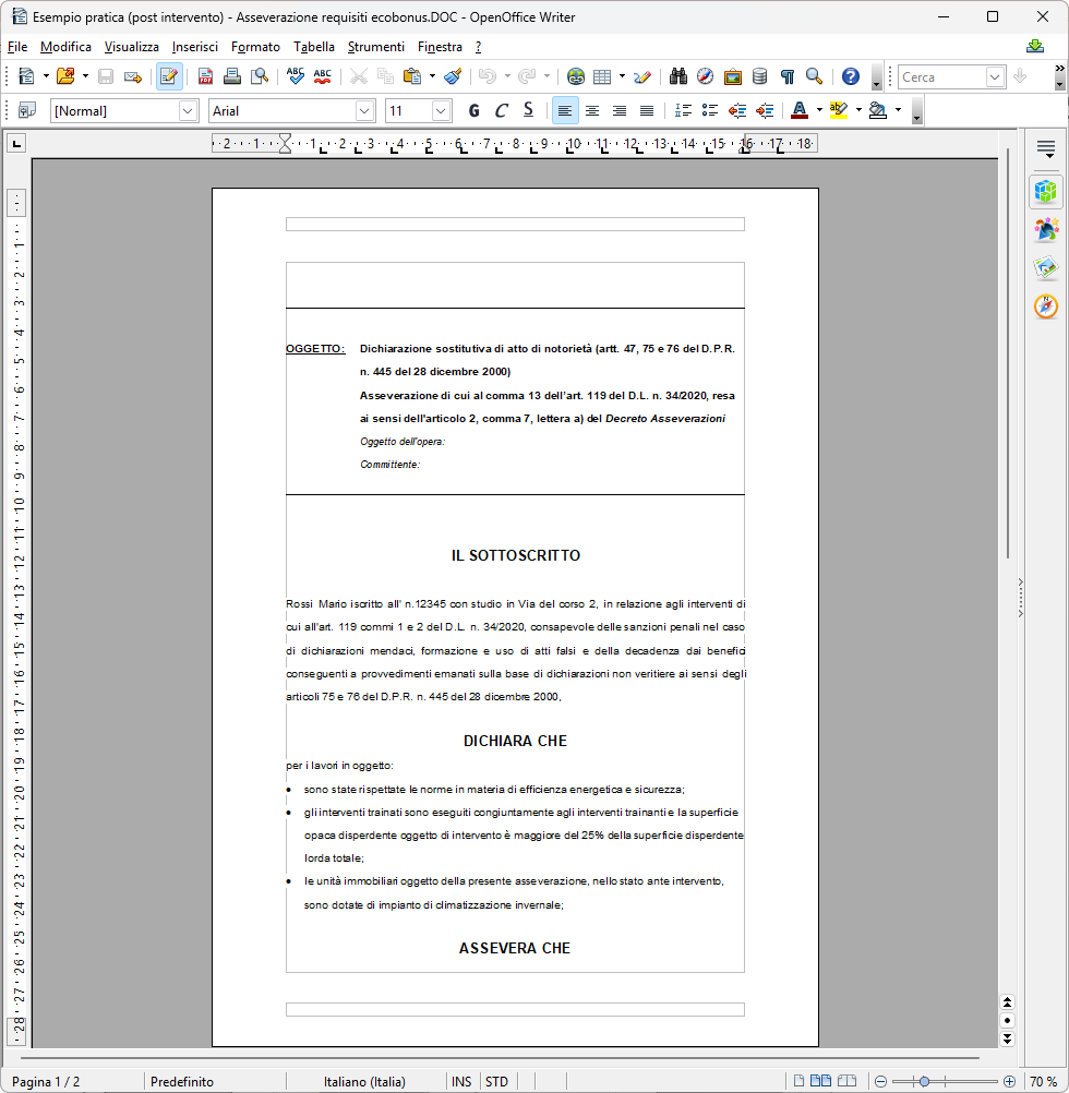La funzione del menu Stampe | Composizione asseverazioni SuperBonus | Asseverazione del tecnico (rispetto requisiti EcoBonus) consente di generare un documento in formato Microsoft® Word®, RTF, HTML o Scriba V, in base alle impostazioni generali del programma. Il documento contiene l'asseverazione con cui il tecnico incaricato attesta la rispondenza ai requisiti di accesso al SuperBonus 110%.