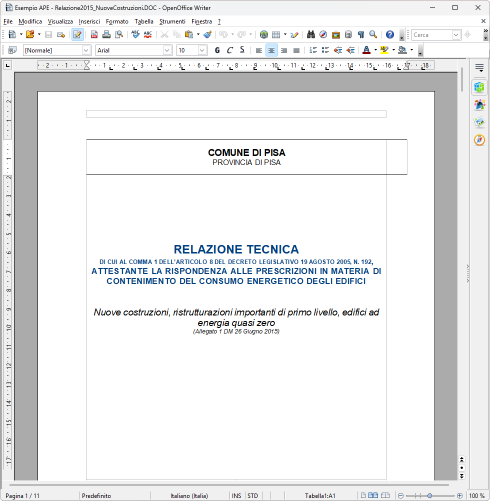 La funzione del menu Stampe | Composizione relazione tecnica consente di generare un file in formato Microsoft® Word®, RTF, HTML o Scriba V, in base alle impostazioni generali del programma, conforme alla normativa vigente per la relazione tecnica.