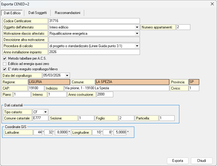 L'inserimento dei dati della pratica avviene con le classiche modalità di Euclide Certificazione Energetica, una volta completati tutti i dati è possibile accedere alla finestra di esportazione tramite la voce del menu Stampe | Esporta file XML in formato CENED+2.