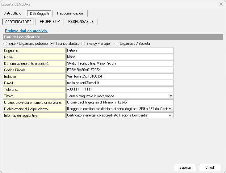 Nella pagina Dati Soggetti è necessario inserire i dati del Certificatore che firma la pratica, i dati della proprietà dell'edificio e i dati del soggetto terzo responsabile.