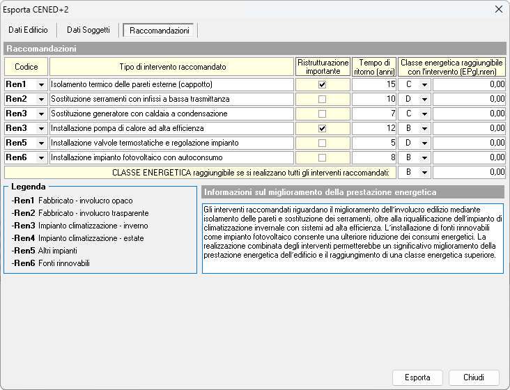 La pagina Raccomandazioni contiene i dati delle raccomandazioni che il certificatore consiglia per migliorare la prestazione energetica dell'edificio.