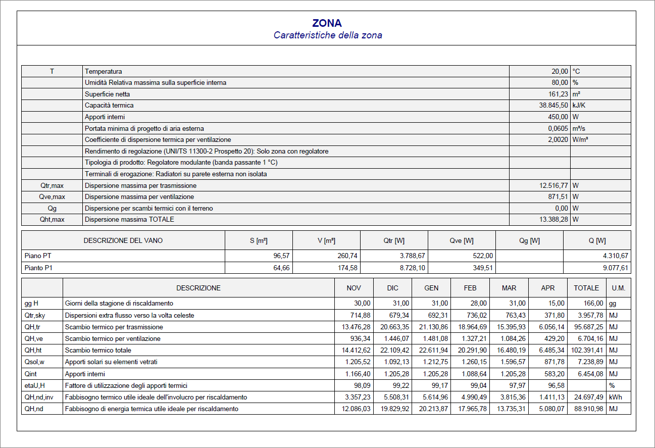 La funzione del menu Stampe | Stampa schede zone e relativi vani genera un report che include le verifiche delle zone e dei vani associati.