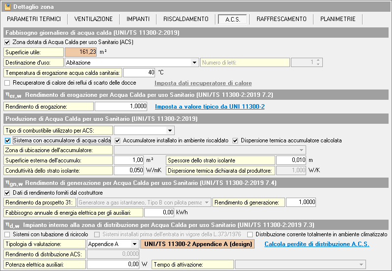 Deve essere inoltre specificata la temperatura di erogazione dell'ACS, necessaria per il calcolo del fabbisogno di acqua calda della zona.