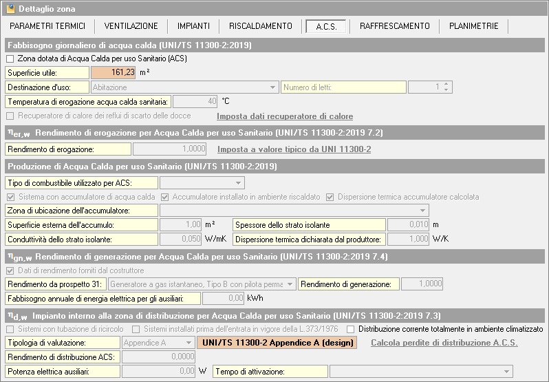 Il primo dato da specificare è se la zona dispone del servizio di Acqua Calda Sanitaria. Questa informazione viene indicata tramite la spunta Zona dotata di Acqua Calda per uso Sanitario (ACS). Se la spunta non è attiva, tutti i campi della pagina vengono disabilitati.