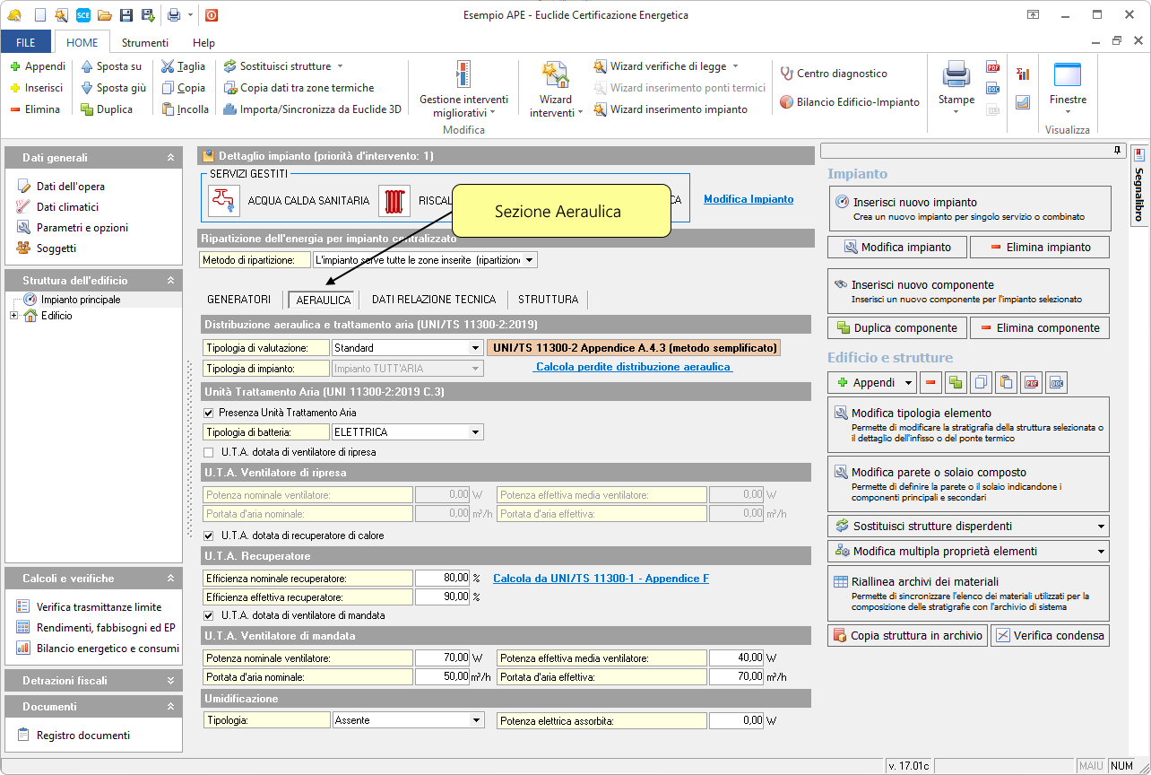 La sezione Aeraulica dell'Impianto consente di inserire i dati necessari per i calcoli relativi agli impianti di distribuzione ad aria.