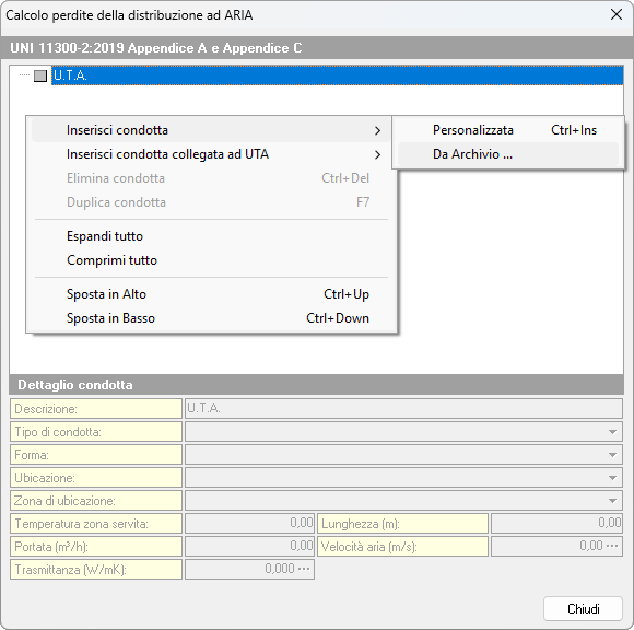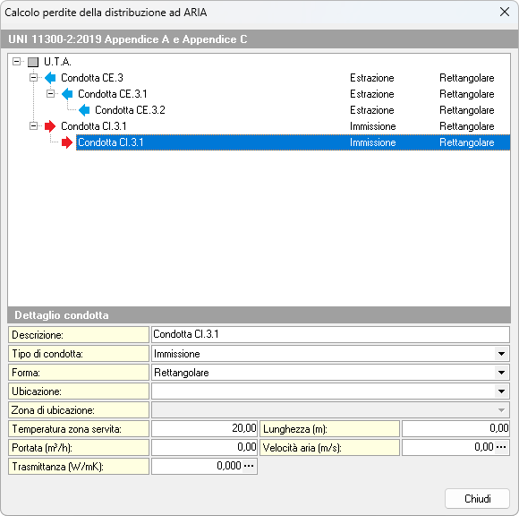 Questa finestra, analogamente a quella relativa alle perdite di distribuzione ad acqua, è divisa in due parti: nella parte superiore si trova l'elenco delle condotte, rappresentate in una struttura ad albero che può avere più livelli, partendo da quelle collegate all'UTA (allineate più a sinistra) fino ad arrivare a quelle collegate ai terminali delle utenze (allineate più a destra).