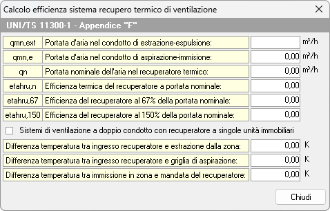 I dati riguardanti l'efficienza di un eventuale recuperatore di calore possono essere inseriti manualmente, se noti, oppure calcolati attraverso l'Appendice F della UNI/TS 11300-1. Selezionando l'apposito tasto si apre la finestra per il calcolo dell'efficienza.