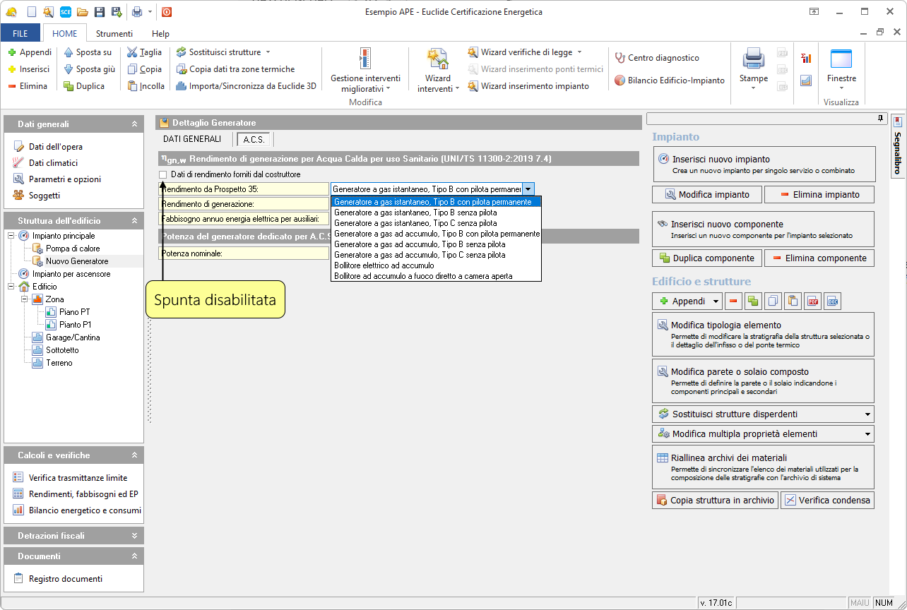 Se il rendimento non è noto, il software consente di prelevarlo dalla norma selezionando il tipo di generatore nel campo Rendimento da Prospetto 35.