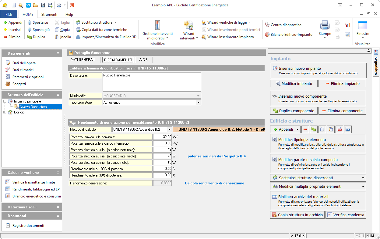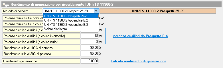 Per il calcolo del rendimento del generatore sono disponibili diverse opzioni: Appendice B.2, Appendice B.3 e Prospetti 25-29 della UNI/TS 11300-2, oltre al metodo Valore dichiarato. A seconda della modalità selezionata, il software attiva o disattiva i campi necessari per l'inserimento dei dati specifici, come ad esempio la tipologia di bruciatore, il rendimento utile a diversi carichi e altre informazioni richieste dalla normativa di riferimento.