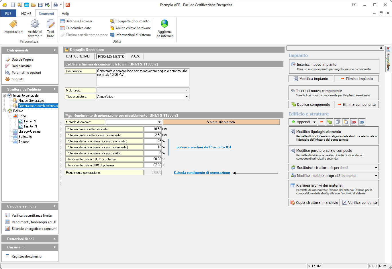 Per il calcolo del rendimento di generazione, bisogna utilizzare il comando Calcola rendimento di generazione, situato all'interno della sotto-sezione denominata Rendimento di generazione per riscaldamento (UNI/TS 11300-2).