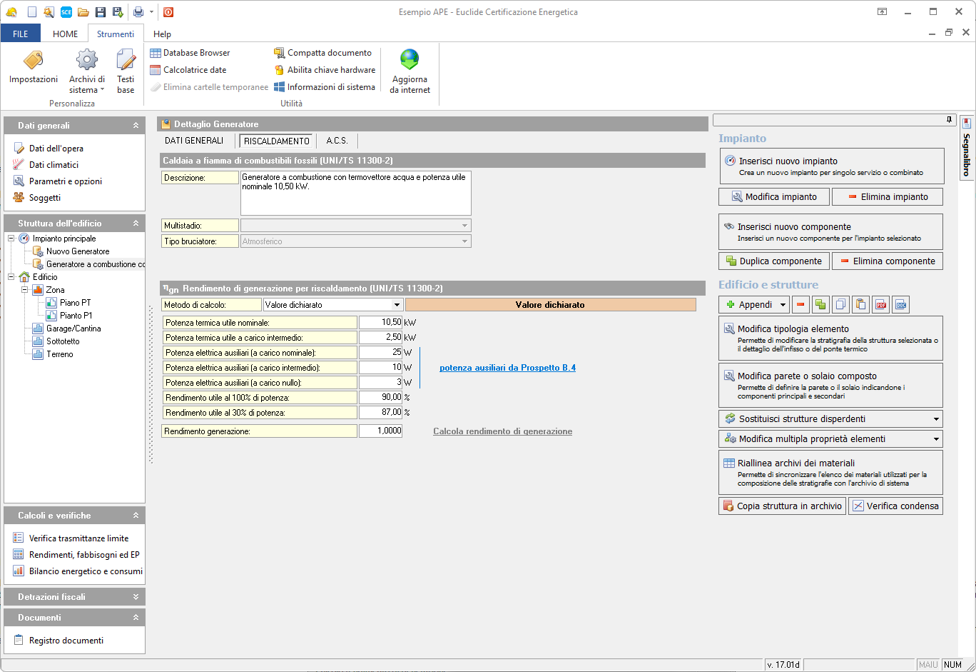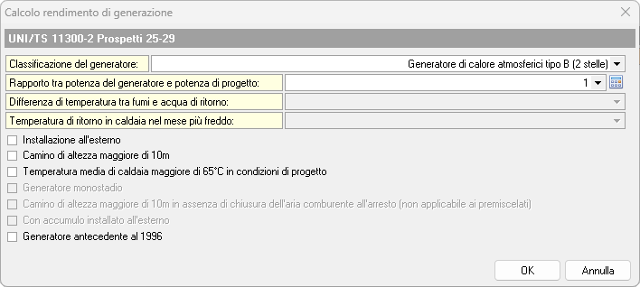 Classificazione del generatoreRapporto tra potenza del generatore e potenza di progettoDifferenza di temperatura tra fumi e acqua di ritornoTemperatura di ritorno in caldaia nel mese più freddo