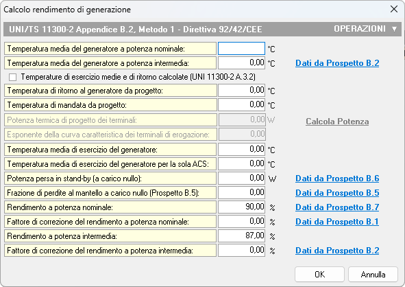 Se si sceglie il metodo di calcolo UNI/TS 11300-2 Appendice B.2, nella finestra di Calcola rendimento di generazione, occorre compilare tutti i dati.