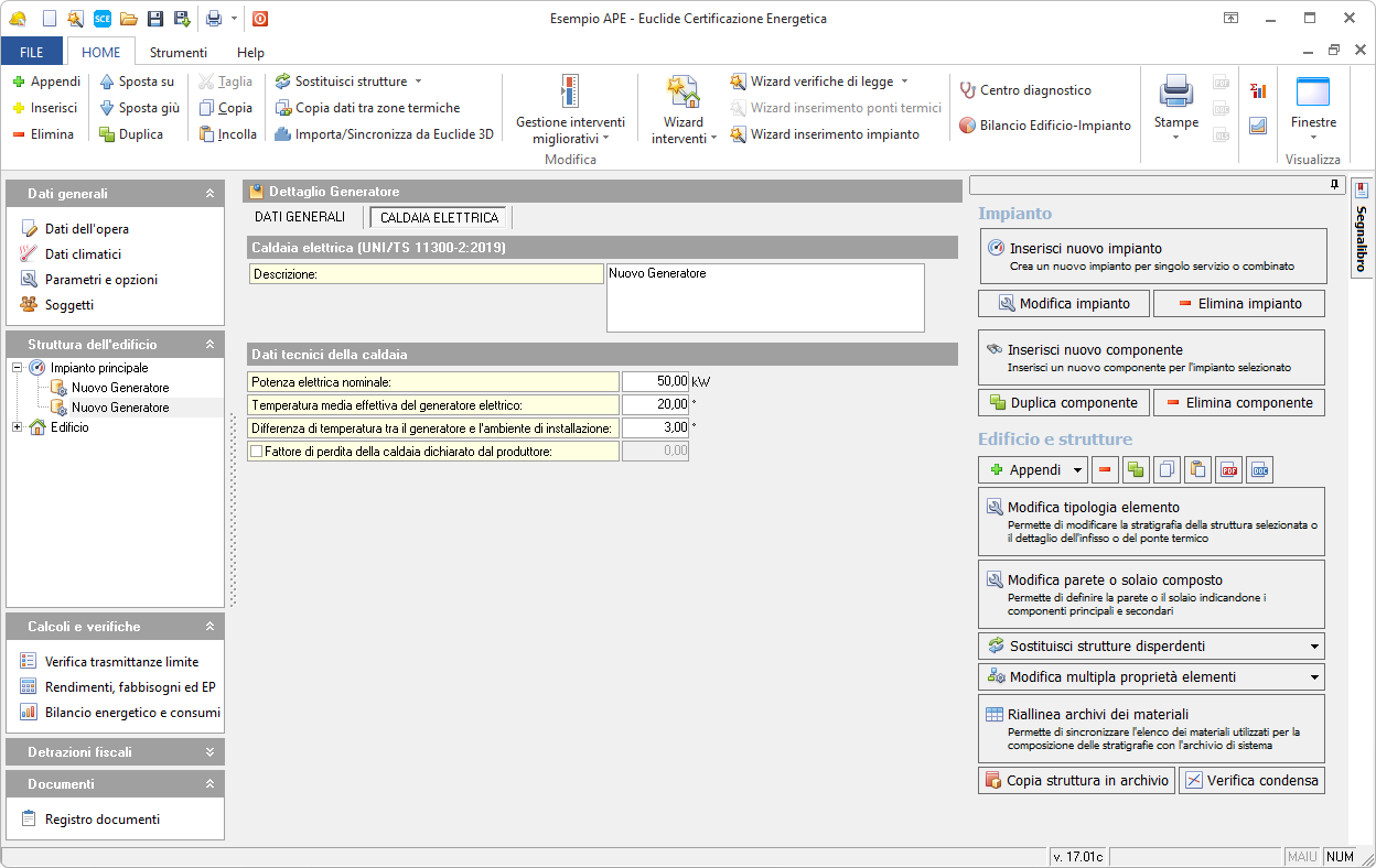 La tipologia di generatore Caldaia elettrica presenta una sezione Dati generali analoga a quella degli altri generatori.
