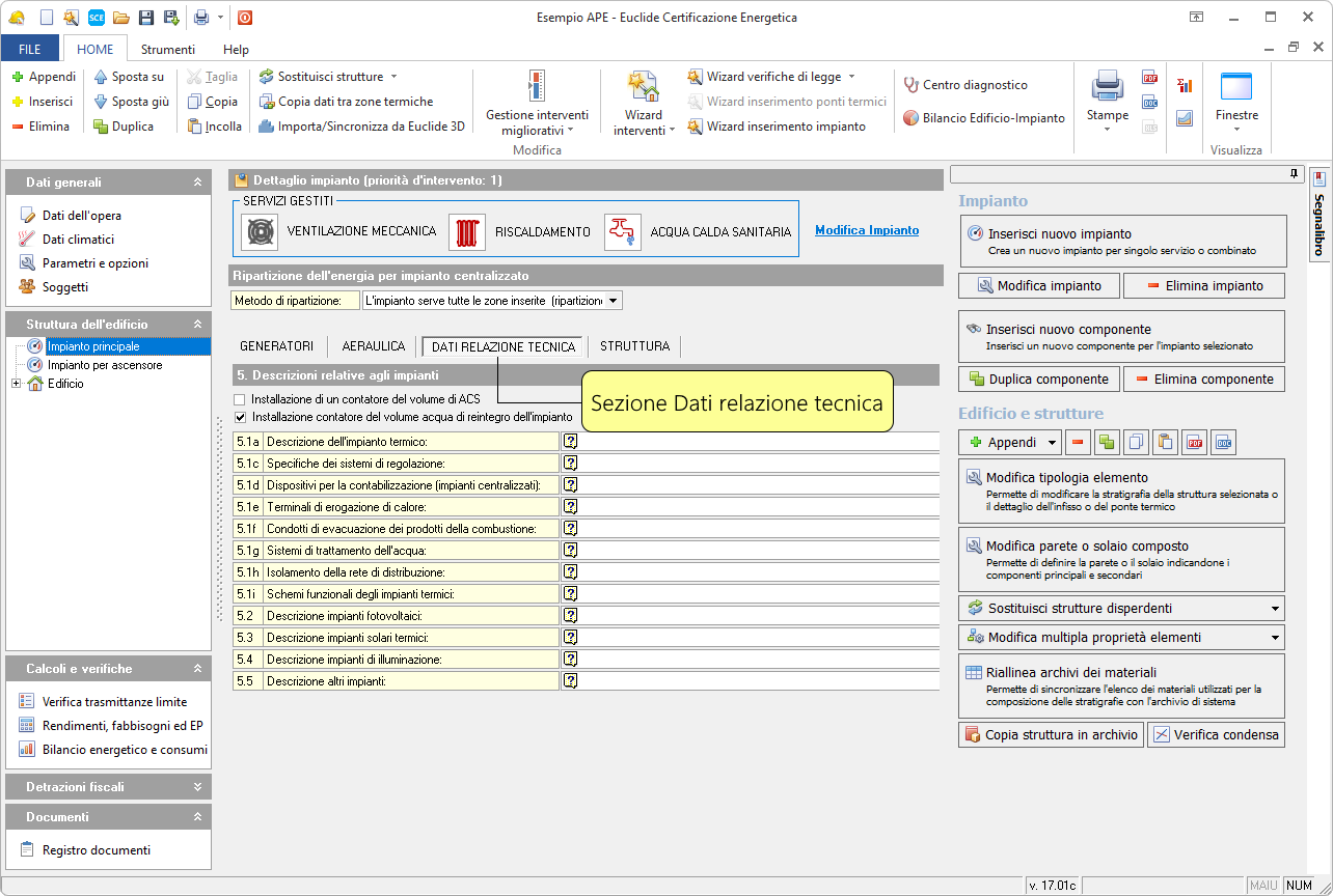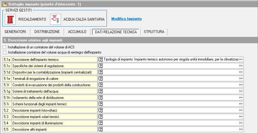 La sezione Dati relazione tecnica della pagina Impianto contiene campi in cui è possibile inserire descrizioni relative agli impianti.