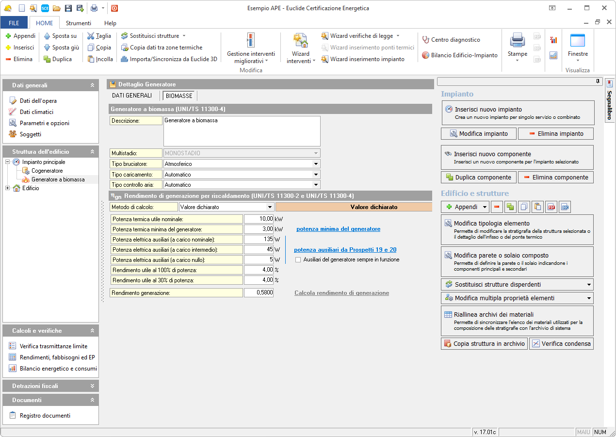 Euclide Certificazione Energetica considera generatori a biomassa solida (legname, pellets, ecc.), sia a caricamento manuale che automatico, e generatori a biomassa liquida o gassosa.