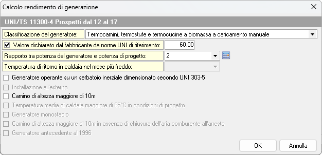 Valore dichiarato, il tastoCalcola rendimento di generazionesarà disabilitato e il valore dichiarato dal produttore va inserito direttamente nel campoRendimento generazione. - Se si seleziona il metodo UNI/TS 11300-4 Prospetti 12-17, premendo il tasto si apre una finestra con diversi campi di inserimento, tra cui menu a tendina e spunte. In base alle scelte effettuate nei vari campi, il software propone automaticamente il valore di rendimento previsto dalla normativa.