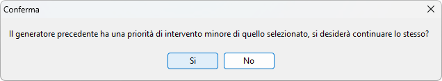 La priorità di intervento dipende dall'ordine in cui sono indicati i vari generatori. È possibile modificare la priorità utilizzando i tasti Sposta Su e Sposta Giù presenti nella barra degli strumenti o dal menu associato al tasto destro del mouse. Ad esempio, spostando in alto un bollitore per ACS che di default ha priorità più bassa (livello 5) rispetto a una pompa di calore (livello 4), il programma avverte che il generatore precedente ha una priorità minore ed è necessario indicare se si desidera continuare. Selezionando Sì, il bollitore per ACS passerà sopra la pompa di calore nell'elenco.