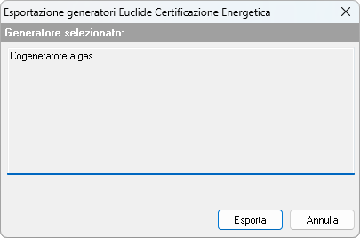 All'interno della struttura dell'edificio, nel nodo Impianto, tramite il menu contestuale accessibile con il tasto destro del mouse, è possibile scegliere la funzione Esporta generatore su file .GLX.