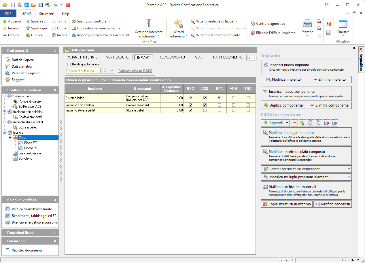 Per associare un impianto alla zona, è necessario cliccare con il tasto destro del mouse e selezionare Inserisci impianto. Nella finestra che appare, scegliere la tipologia di impianto da associare.