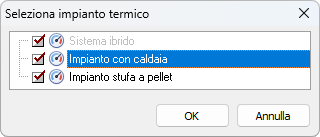 Le pagine visualizzate all'interno di questa finestra (ad esempio Riscaldamento, ACS, Ventilazione, ecc.) compaiono solo ed esclusivamente se il relativo servizio impiantistico è stato precedentemente inserito.