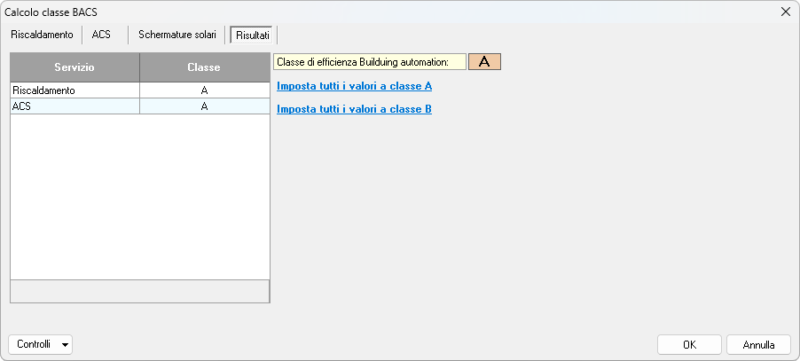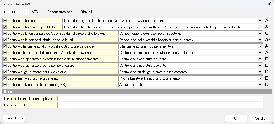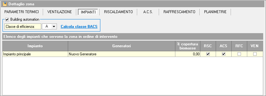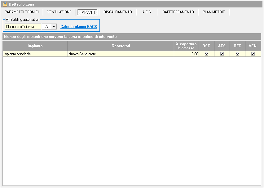Selezionando l'opzione Building automation, il sistema consente di calcolare la classe di efficienza e il relativo risparmio energetico dei sistemi BACS (Building Automation and Control Systems). In questo modo è possibile determinare la classe di efficienza dell'impianto in conformità alla norma UNI EN 15232-1.