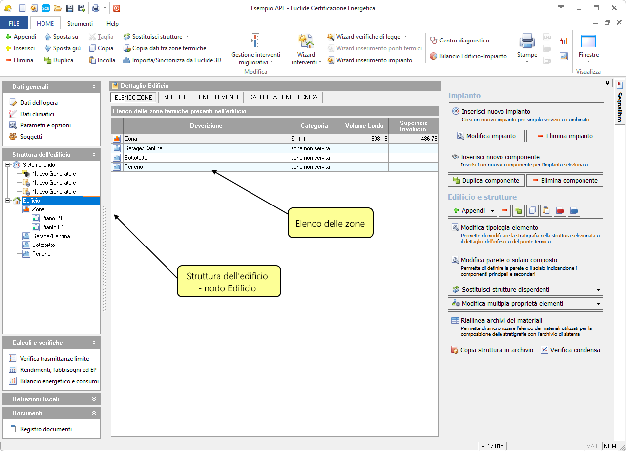 La pagina Edificio è suddivisa in tre sezioni, selezionabili tramite i pulsanti nella parte alta dello schermo: