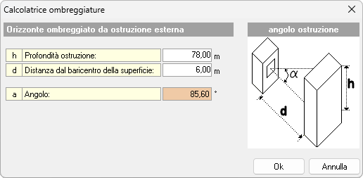 Se non si conosce l'angolo, utilizzare il pulsante con i tre puntini per calcolarlo inserendo profondità e distanza dell'ostruzione.