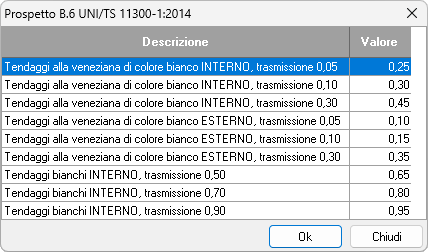 Fattore di riduzione dovuto ai tendaggi - FC: solo per infissi. Cliccare sul pulsante a lato per prelevare i valori da Prospetto B.6 della UNI/TS 11300-1. Il fattore riduce l'apporto solare.
