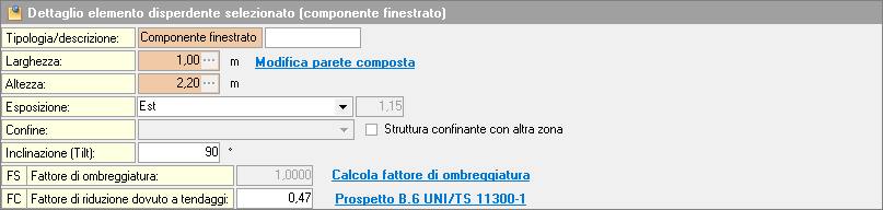 Fattore ombreggiatura - FS: presente in tutte le tipologie. Se l'elemento è soggetto a ombreggiature, cliccare suCalcola fattore di ombreggiaturaper indicare l'angolo d'ombra delle ostruzioni esterne, aggetti orizzontali e verticali.