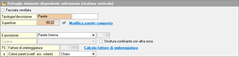 Colore pareti (coeff. ass. solare): per strutture verticali e orizzontali, inserire il colore esterno (chiaro, medio, scuro) che incide sugli apporti solari.