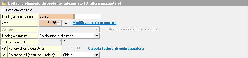 Elemento preesistente (escludi dalle verifiche): se attivo, l'elemento viene escluso dalle verifiche di legge.Facciata ventilata: per strutture verticali e orizzontali. Il flag influisce sul calcolo dell'area effettiva soleggiata e sulQH,tr (scambio termico per trasmissione). Da utilizzare in presenza di componenti con intercapedine d'aria aperta verso l'esterno.