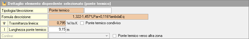 La sezione Dettaglio elemento disperdente selezionato, presente all'interno del Dettaglio vano, mostra campi diversi in base all'elemento selezionato.