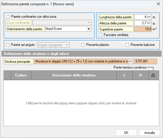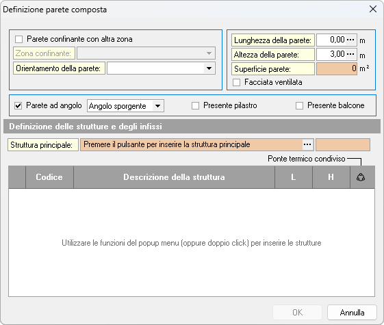 La parte più in basso della finestra contiene un elenco dove inserire elementi che rappresentano discontinuità nella parete, come infissi, ponti termici o parti con spessore o trasmittanza diversa dalla struttura principale.
