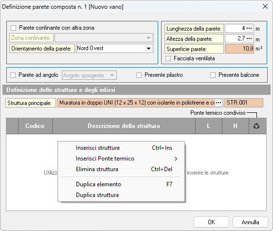Per inserire i ponti termici, utilizzare il tasto destro del mouse all'interno della definizione della struttura e selezionare il comando Inserisci Ponte termico. Le opzioni disponibili sono: Da Abaco, Da archivio personalizzato o Personalizzato. Per maggiori dettagli, consultare la sezione I ponti termici.