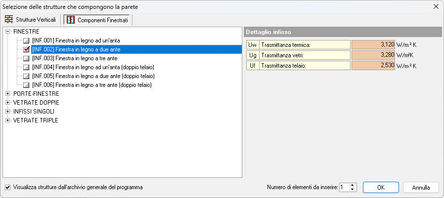 L'inserimento di un nuovo elemento avviene scegliendo una tipologia già utilizzata nella pratica o prelevandola dall'archivio generale. È possibile selezionare il tipo di elemento tra Componenti finestrati e Strutture verticali, utilizzando gli appositi pulsanti nella parte alta della finestra di selezione.