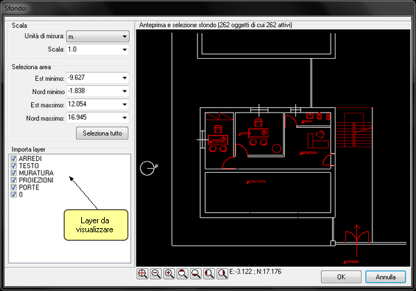 Dopo aver scelto il file, si avvia automaticamente la finestra per l'input grafico. La maschera di selezione dello sfondo permette di selezionare i livelli (layer) da visualizzare o nascondere, facilitando il rilievo. È possibile impostare la scala e l'unità di misura.