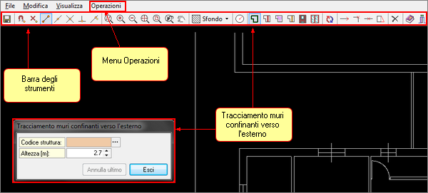 Il disegno è ora pronto per il rilievo degli elementi. Per procedere all'input grafico degli elementi disperdenti, selezionare il tipo di elemento da rilevare tramite le icone sulla barra degli strumenti o dal menu OPERAZIONI.