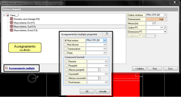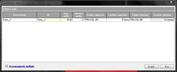 Dopo aver definito le proprietà dei vani, premendo il pulsante Avanti è possibile visualizzare e modificare gli attributi di ogni elemento di ciascun vano. Anche in questo caso, il pulsante Assegnamento multiplo consente di assegnare rapidamente attributi identici a più elementi.