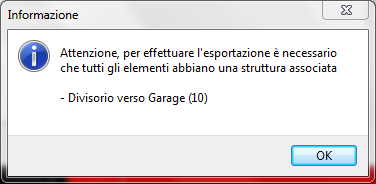 Per effettuare l'esportazione è necessario che tutti gli elementi abbiano una struttura associata. Il software comunica eventuali dati mancanti con un apposito messaggio di avviso, indicando l'elemento interessato.