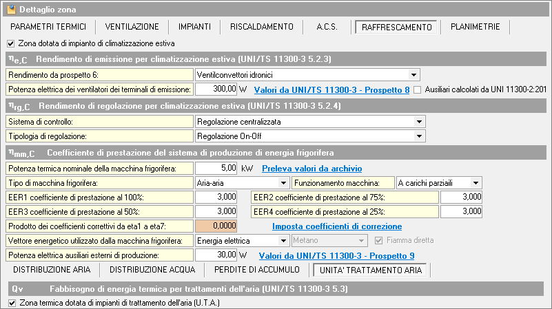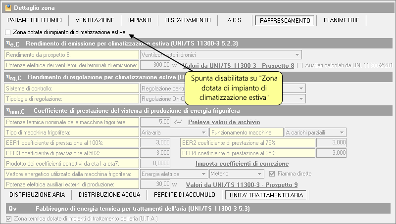 Se invece entrambe le spunte descritte sopra risultano attive, sarà possibile inserire i dati relativi all'impianto di raffrescamento locale per la zona termica. In questo caso, i dati da compilare saranno gli stessi illustrati nel paragrafo dedicato all'impianto di raffrescamento.