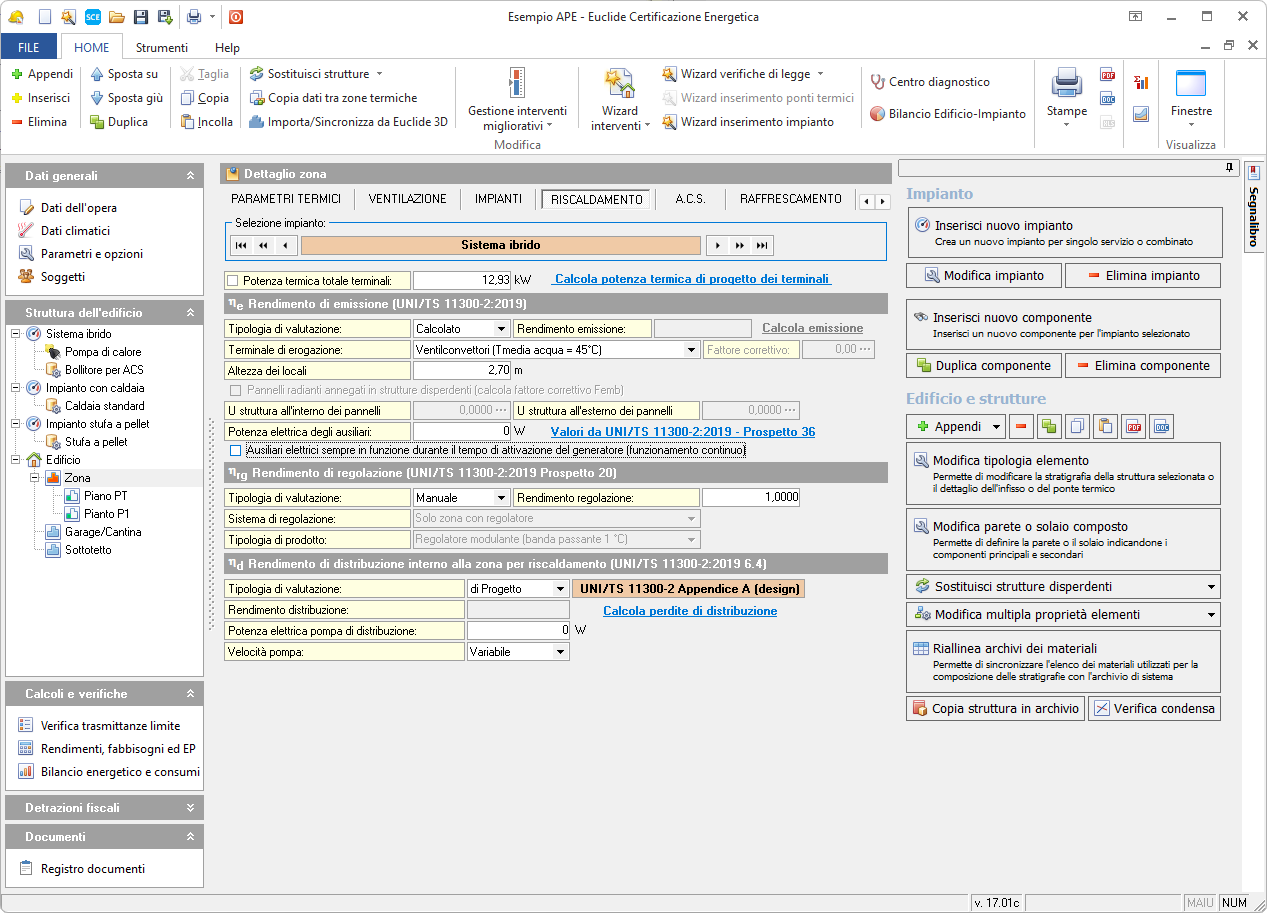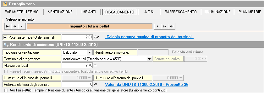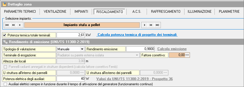 La pagina Riscaldamento consente di impostare i dati necessari al calcolo del rendimento di emissione e regolazione.
